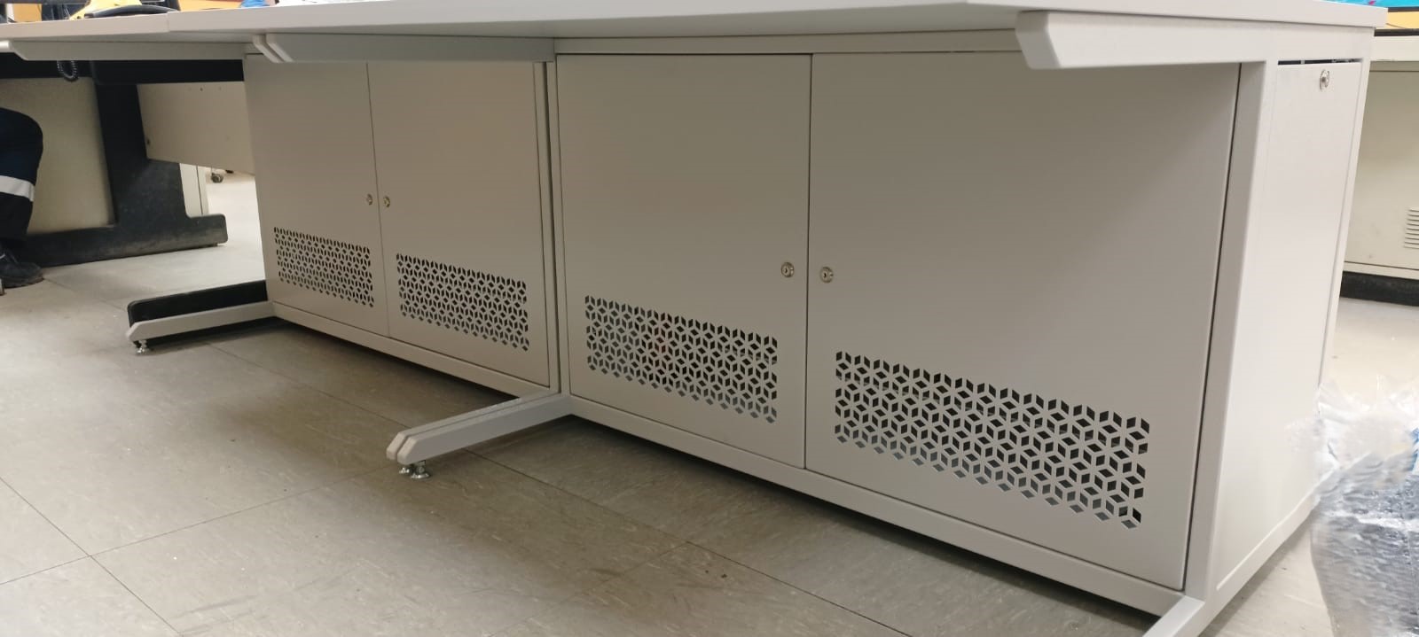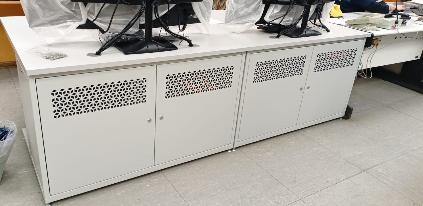 - Стальной конструктив и расположенные под столами технические шкафы выдерживают повышенные нагрузки и отличаются высокой износостойкостью.